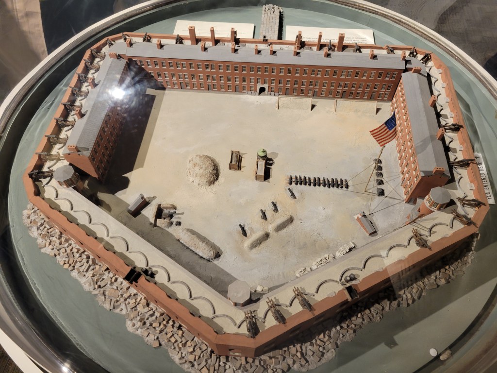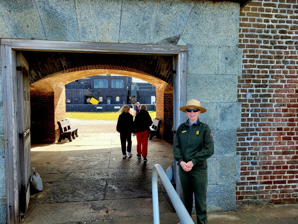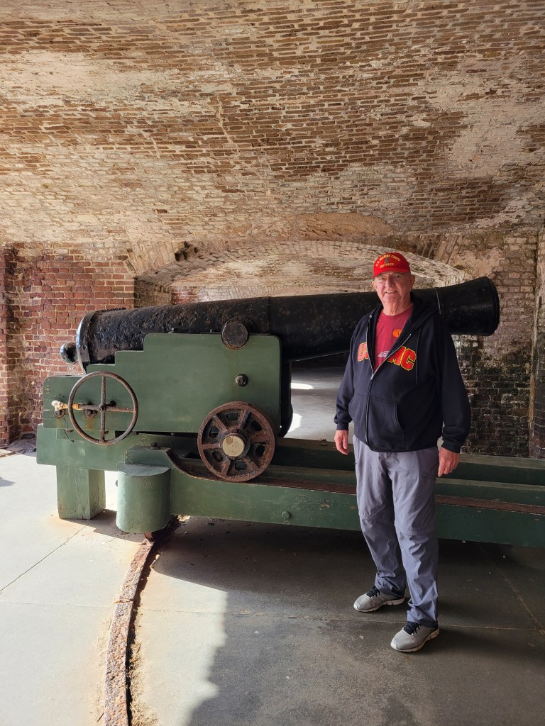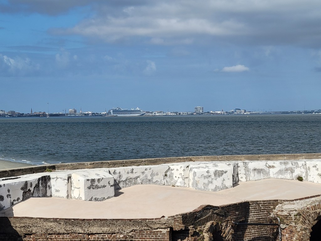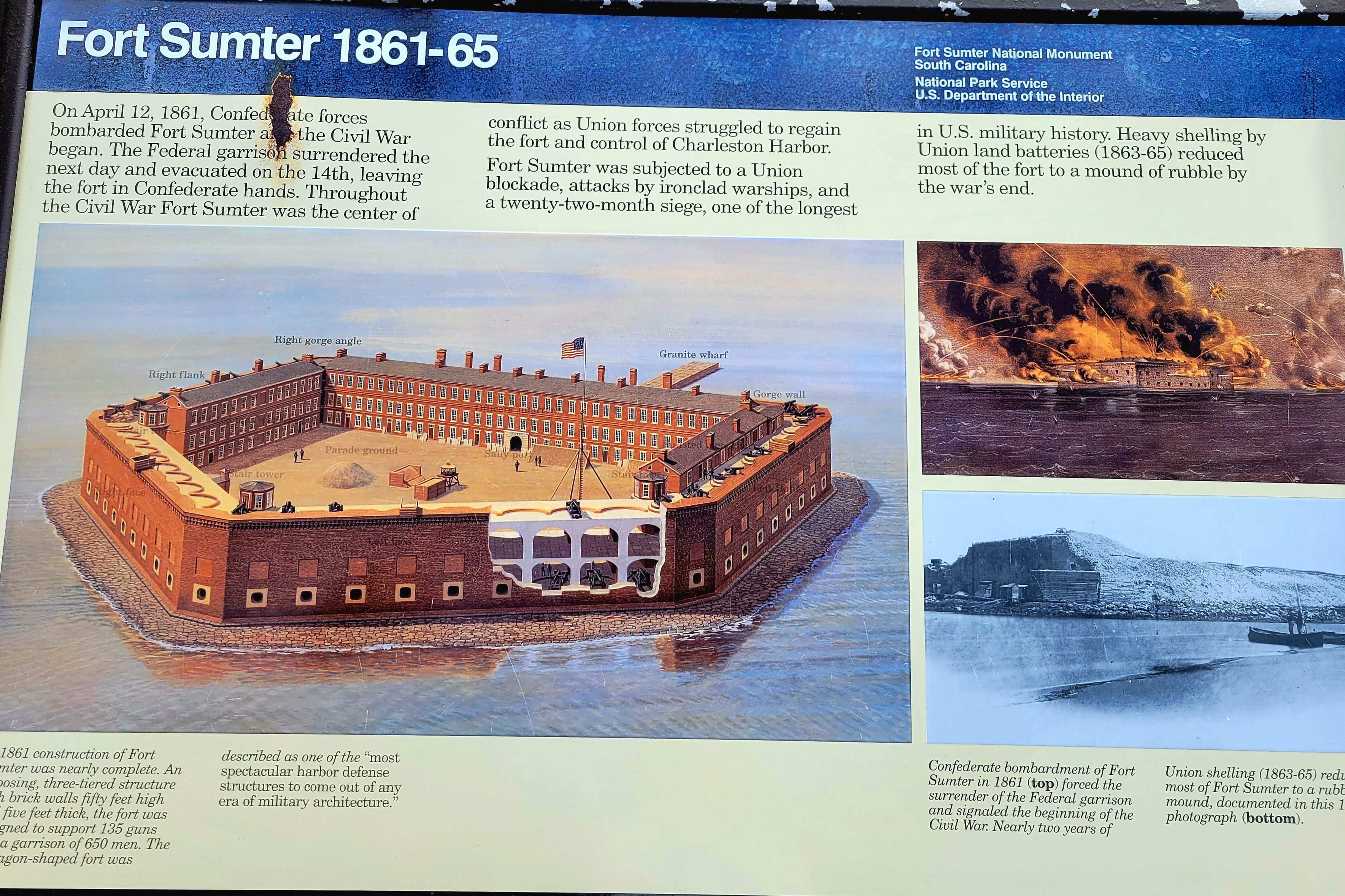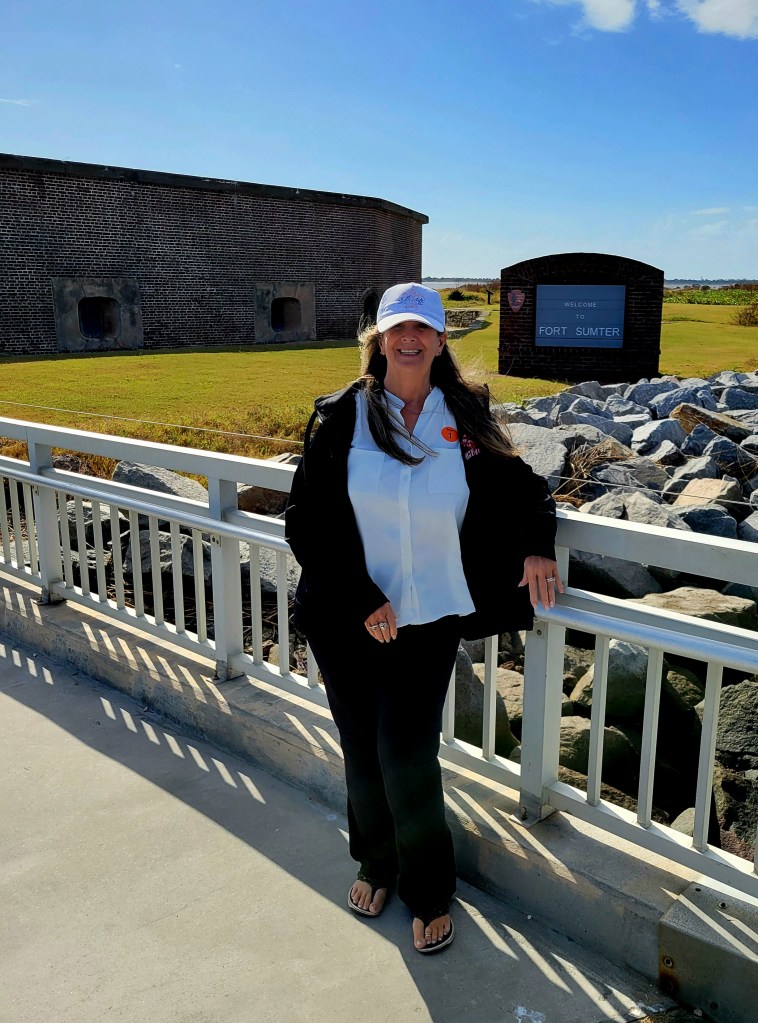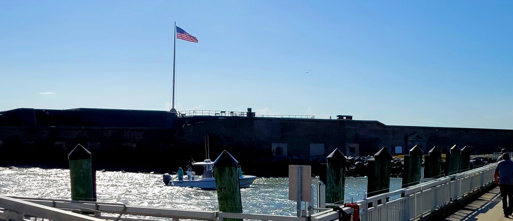 Fort Sumter was built on an artificial island to protect the US from the British during the War of 1812. It is a 5-sided, brick walled fort. Walls were 5 foot thick and between 170 – 190 feet long and 50 feet over the low-tide mark. It was never completed. The massive amounts of bricks needed to complete the fort were made in 3 Charleston locations by slaves. On December 17, 1836, South Carolina ceded Fort Sumter to the United States (It was too costly to maintain it). On April 12, 1861, the South Carolina militia fired on the Union Fort Sumter from the shore of Charleston. It was the first shot of the Civil War. The “battle” lasted 34 hours, when the Union surrendered the Fort, lowered their flag, and left. The second battle was September 8, 1863, when the Union tried to retake the fort. The fort was left in rubble, but remained in Confederate control until it was evacuated in February 1865 as Sherman was in South Carolina. There was an “End of the War” celebration at Fort Sumter on April 14, 1865 and Major-General Robert Anderson, the same officer who took down the flag in 1861, came back and raised the same flag back over Fort Sumter. Ironically, that was the same day President Lincoln was assassinated. In 1947 it was taken over the National Park Service.