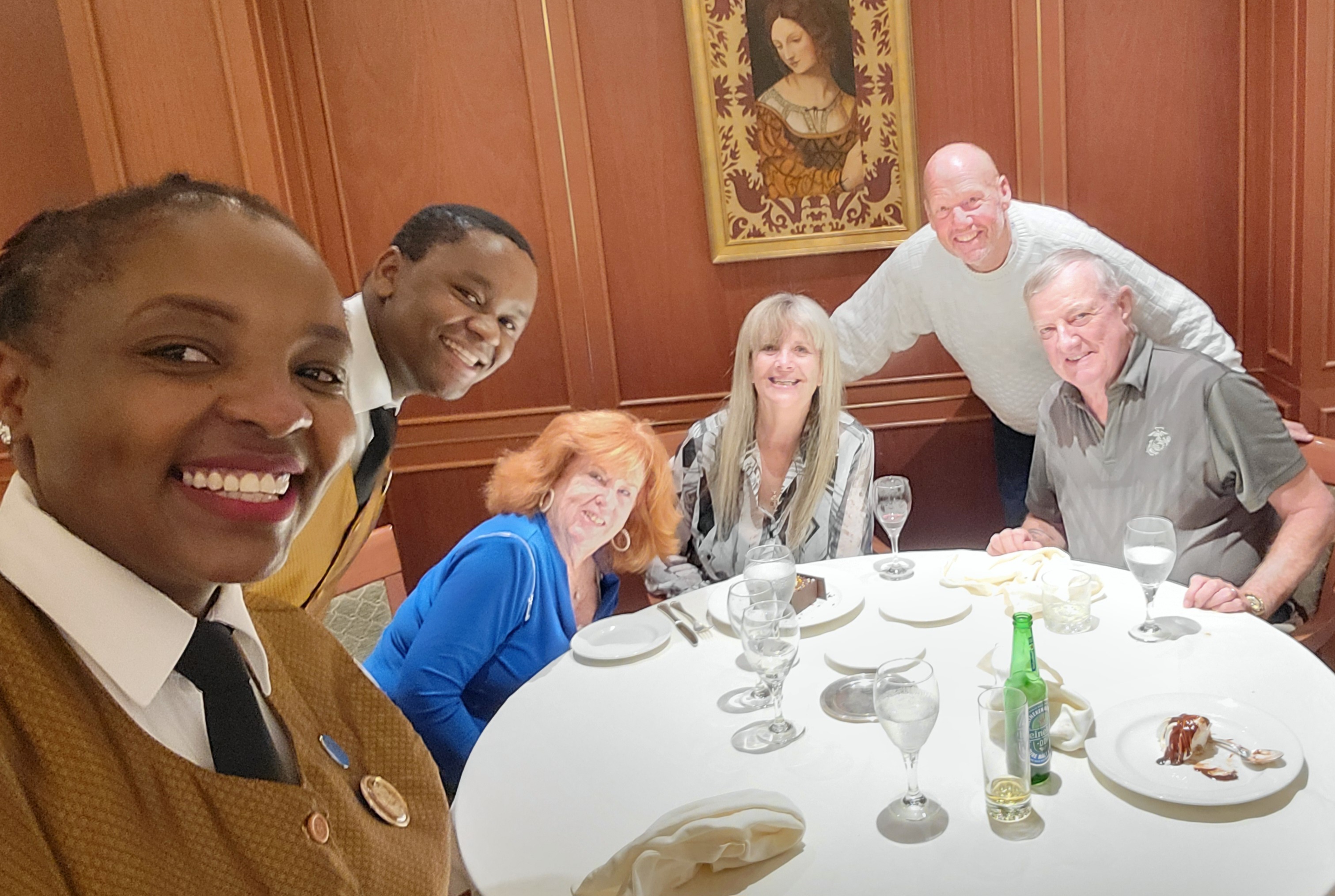 Day at Sea and our last full day aboard the Emerald Princess. The ship was beautiful, but what made the trip special was the people. Our cabin steward Ryan from the Philippines was probably the best attendant we have ever had. He made our cabin home for our 14 days. He has been with Princess for 21 years. We always try to find our “favorite” bar. On the Emerald, it had to be Good Spirits because of Christian from Peru. When he found out I liked Fireball, he told me there wasn’t much on the ship and they would not be restocking it. Guess it’s not in high demand. But Christian found every last drop on the ship …. it got to be the standing joke. He’d see us coming, give me a smile or a frown, depending on his daily search results, then get Mr. Patrick’s drink ready … with extra ice. And to the best of his knowledge, there is not a drop of Fireball on the entire ship now!! We did not have standing dinner reservations, but we were seated at a table for 6 on night two. After having Julia and Samuel as our waiters, and welcoming us as family, four of us were willing to wait for a table every night there after just to have the smiling duo. We didn’t go to the dining room for the food, but for the friends we made there.