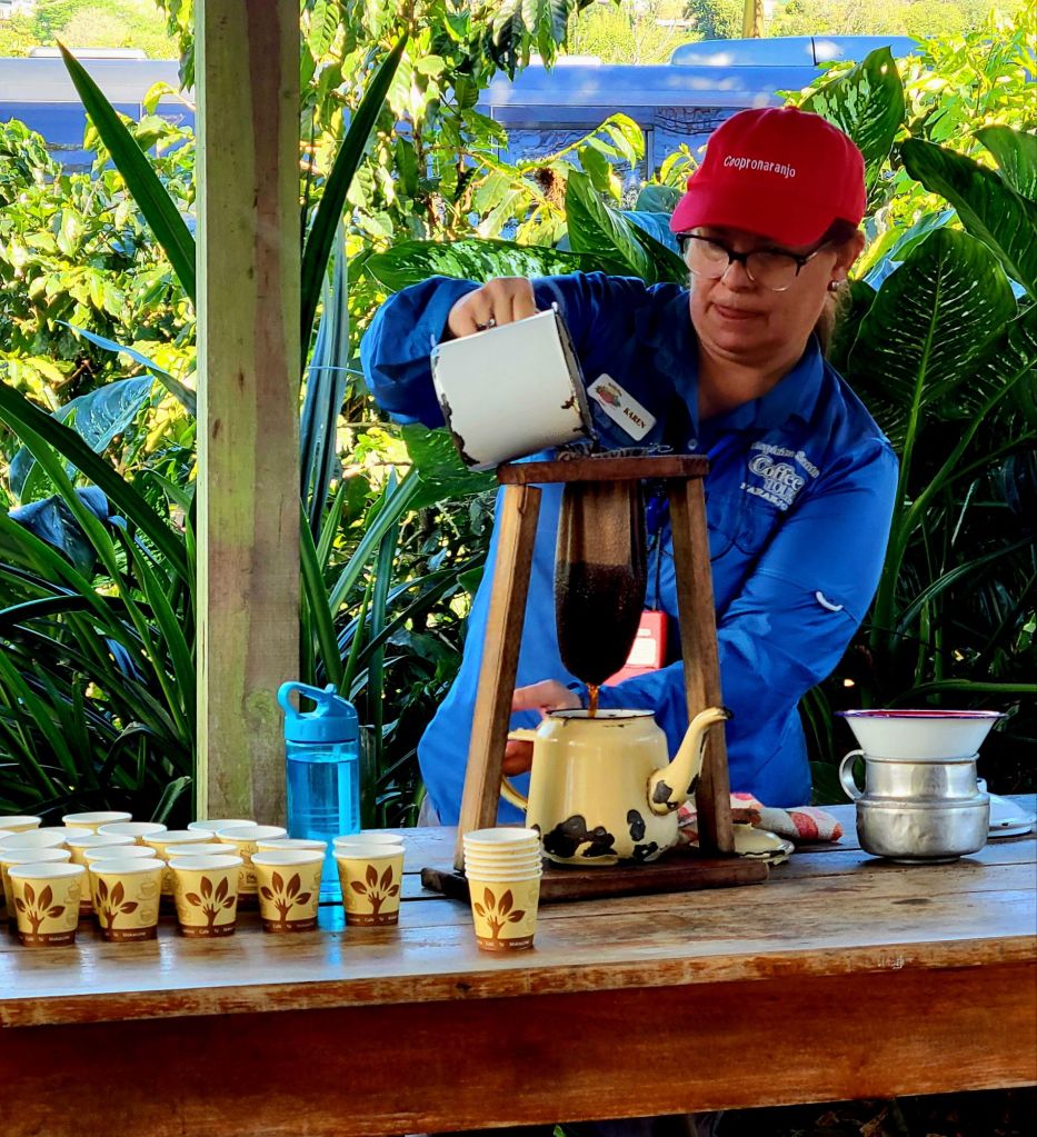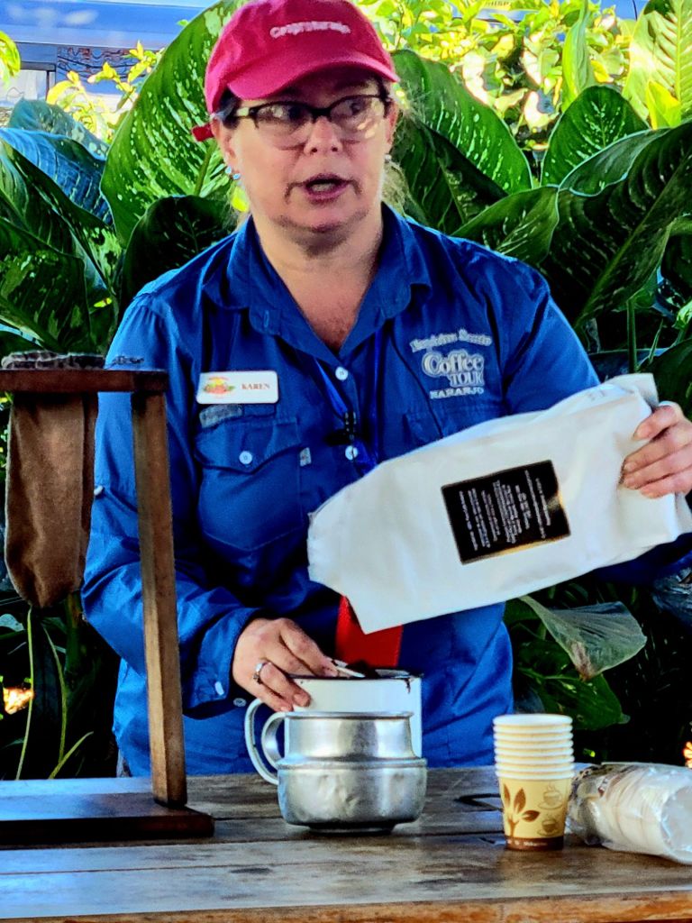 Karen tempering the coffee pot with hot water to keep it warmKaren pours the coffee through the cotton filter. The original drip coffeeonly a small sample,,,,, but the taste !!! Bought two bags to bring home
