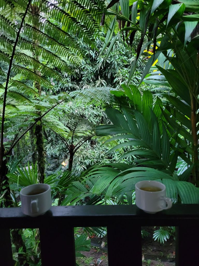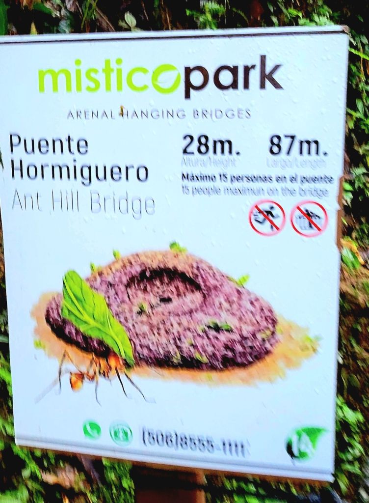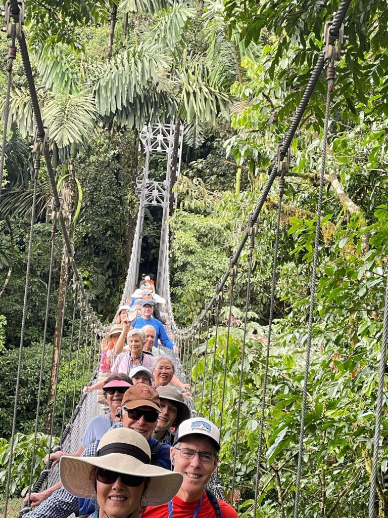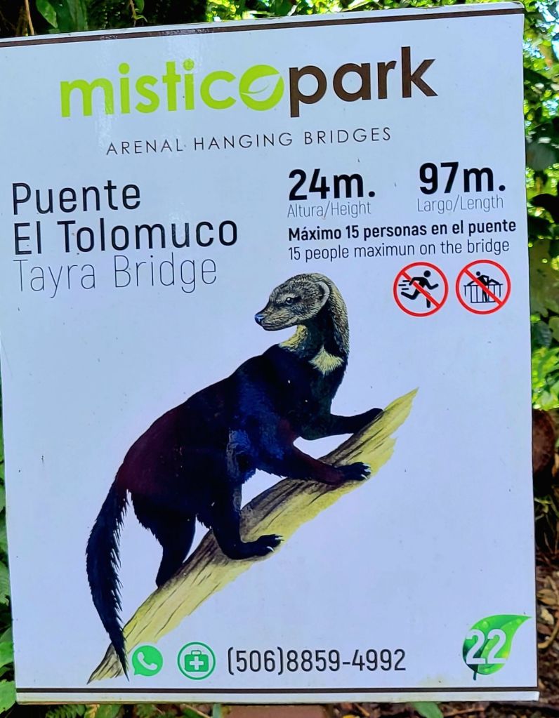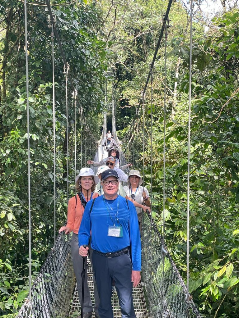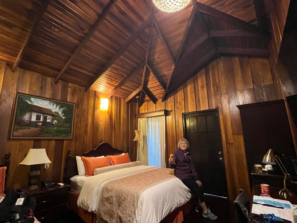 A small town that began to flourish with eco-tourism in the 1970’s. It is located at the base of the Arenal volcano. It is about 1800 feet above sea level. In 1968 the cone shaped Arenal volcano erupted at 7:30 am. The devastation was extensive. There are some areas that will never totally recover. There were 70 deaths. At this time, many hot springs were created and there are many hotels and tourist areas that include these hot springs. In 1970, a dam was constructed and created Arenal Lake. It is a well-known fishing spot for Rainbow bass. We are staying at Lomas del Volcan hotel. I cannot even do justice to our accommodations. We have individual cabins in our own little spot of heaven. Two queen beds, a huge bathroom, a front porch, but the best is the back porch with a view of the rainforest. Even though there are a lot of cabins, it feels very private. We were warned to keep our doors closed and locked …. not from any people, but if it was open, monkeys might visit and help themselves to whatever. We had a bit of time to rest, then off to our included dinner. It was delicious. Pat got a grilled steak and I had a filet. Some of the best beef ever. Today we had breakfast with one of my favorites, homemade corn tortillas. On the bus by 7:30 am and thank you Ozzy for making this an early departure. Off to Misticopark, about a 30-minute ride. Definitely kudos to our bus driver. Not an easy drive for him. We did the Arenal Hanging bridges. Haven’t experienced anything quite like it. About a 2 hour, 2 mile hike in a rainforest, with 20 bridges, some stationary, some cable suspended. The path is well maintain, the bridges are checked daily for safety. And they are not kidding when the say “hanging”. You are way up in the air, crossing some pretty long stretches. The longest was 95 meters. Ozzy is a naturalist, so his insight into the rainforest, it’s residents and its ecosystem was amazing. I learned so much. Parts of it were challenging for me, some long inclines and steep downward switchbacks, and it definitely helped me get over my fear of heights (I think). Back to the hotel and a cooking lesson. We made homemade corn tortillas and watched them make picadillo, a potato dish. We crashed for the afternoon. We chose to eat dinner here instead of going into town. We weren’t that hungry and still a bit tired. I had a chicken & shrimp quesadilla and Pat had cerviche. Both were excellent. Shower & bed, as tomorrow is another new adventure.
