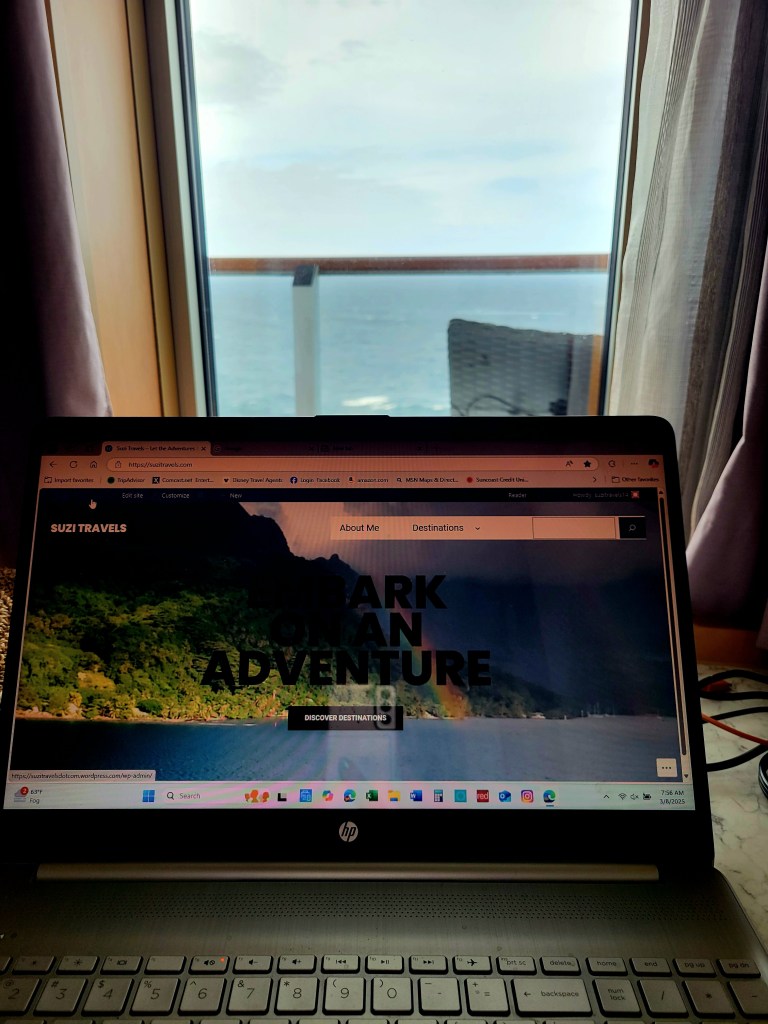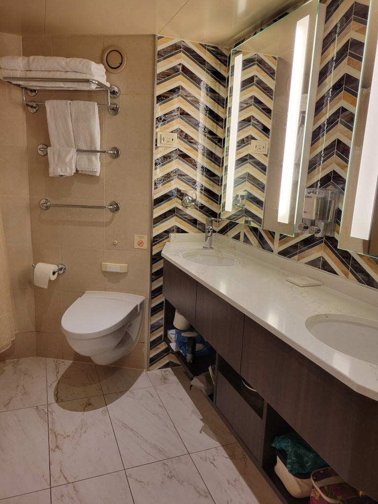 Our first day of vacation actually started out on Tuesday, March 4th with a rental car and a drive to Miami. About 45 minutes into the drive, we got a text saying our flight was delayed …. 10 hours now leaving the next morning. We pulled into a rest stop and I went to work. I sent a text to our transportation, called Holland America to make sure we could get on the ship that late in the evening and got a hotel room in Miami for the night. The Fairfield Inn doesn’t have a restaurant, so we were going to walk around the corner to the Marriott, but as we entered our room there was an ad for pizza delivery. Sold — eating pizza 45 minutes later. Up early and at the airport at 5:30am and at the Turkish Airlines lounge by 6:30am. We boarded our American Airlines non-stop flight for 9 hours from Miami to Buenos Aires. We had a private shuttle to the Holland America Oosterdam which was wonderful. Our driver spoke clear English and was full of so much information about Buenos Aires. The port immigration was open, but empty. Another couple and us were escorted through immigration & customs and put on a shuttle bus to the ship. That was the silver-lining to our delayed ordeal. I can’t even imagine the crowd earlier in the day in the stifling 98 degree heat. Some guests said it was pretty bad. So finally, by 8:30pm, we were on our ship the Oosterdam !!!! We went to our cabin 8086 and I got to surprise Patrick with a Signature Suite. I figured if we were going to be on here for 31 days, we deserved more space. Good night folks.