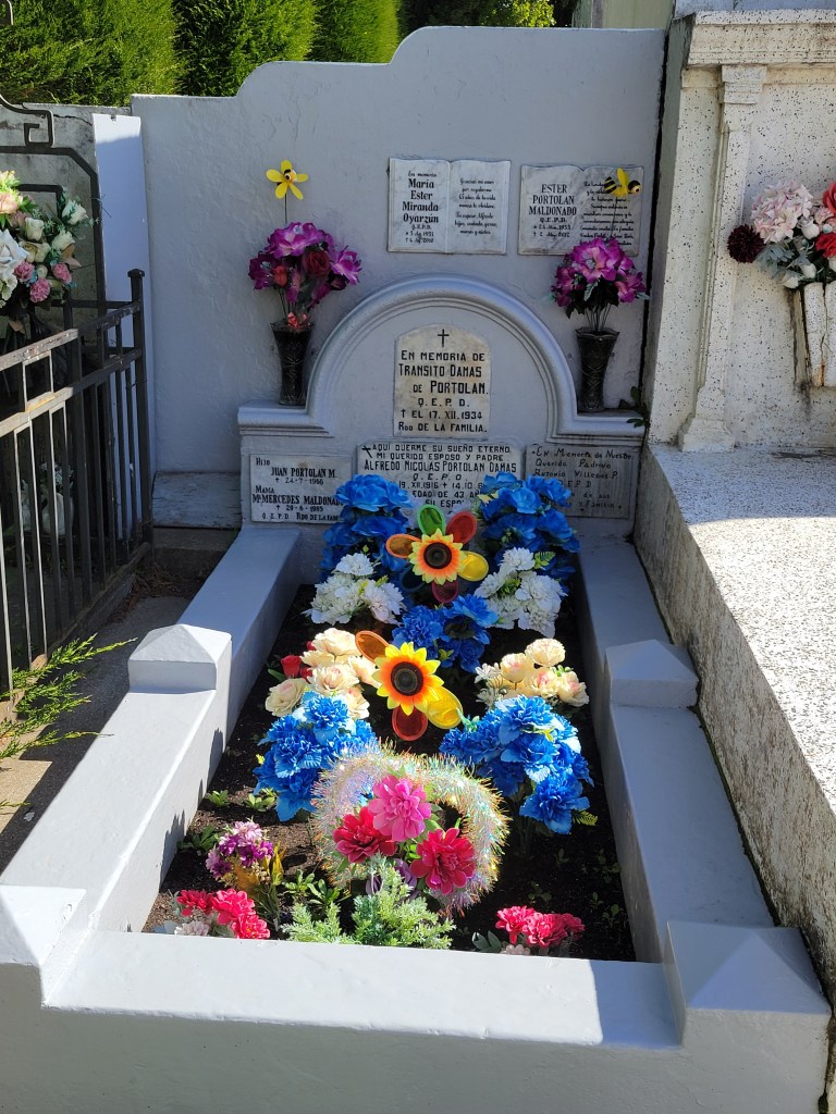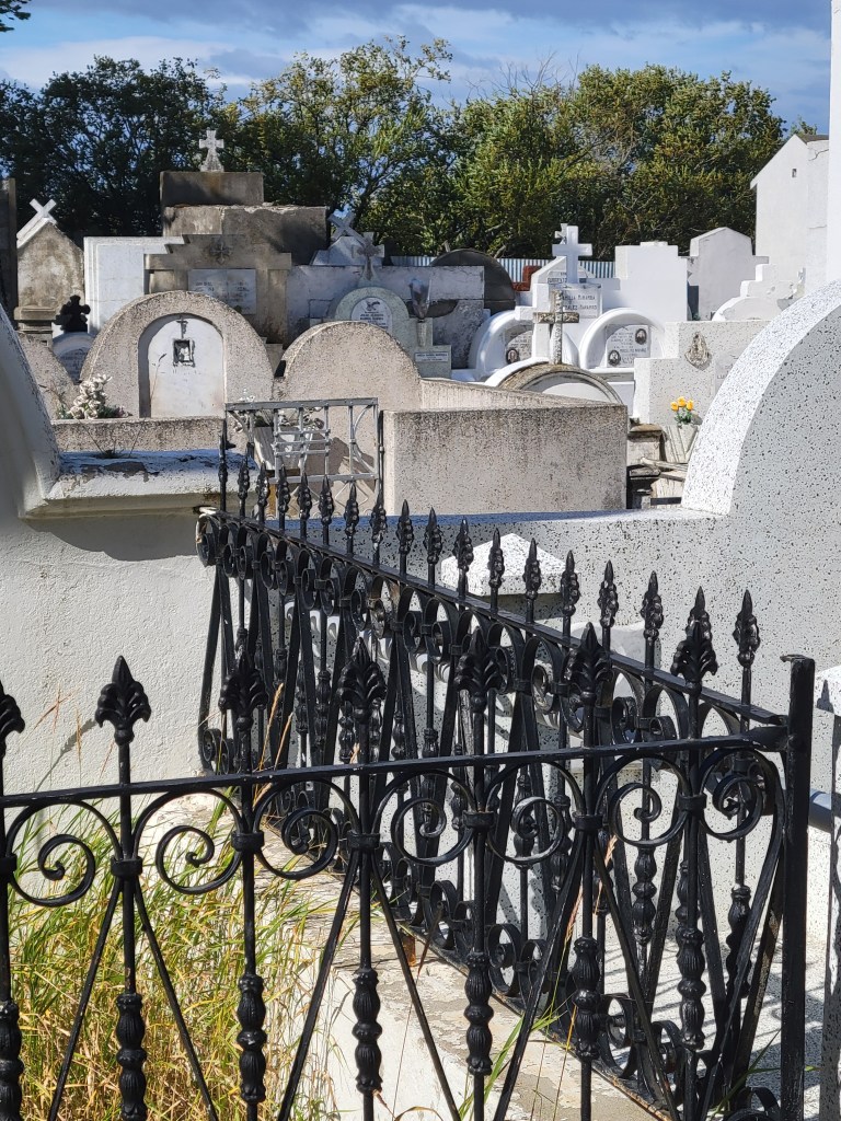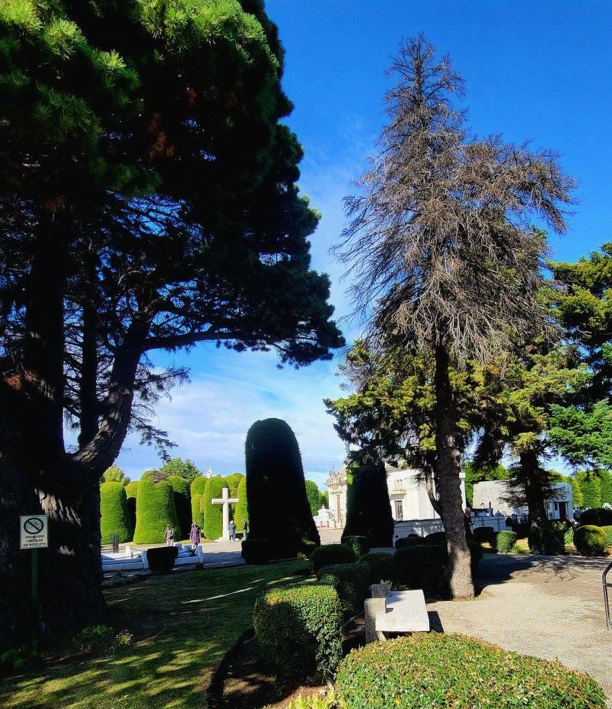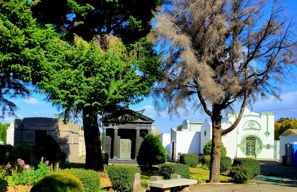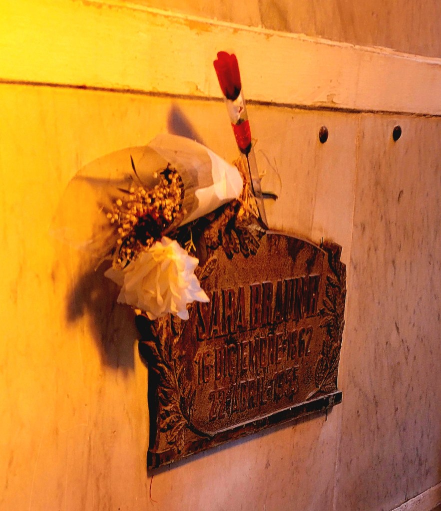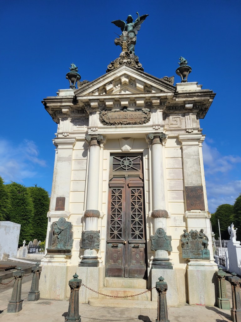The Punta Arenas cemetery is officially called the Cementerio Municipal Sara Braun (fact not myth). The huge stone gateway was donated in 1919 by Sara Braun, the richest and most influential woman in Patagonia at the time. (Think Eva Peron in Argentina.) Urban legend has it that she asked to be only person to go through the gate when she died. This seems to be true since the main entrance has been sealed off/closed (unused rusted parts not helping), and you have to enter the cemetery through a side entrance.