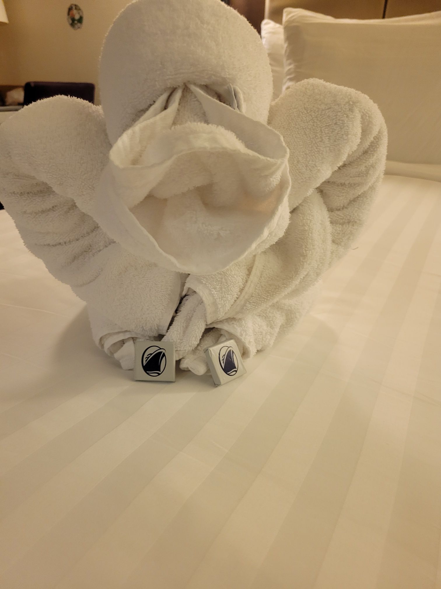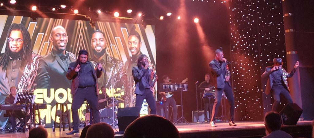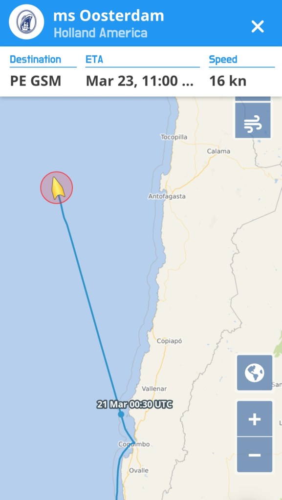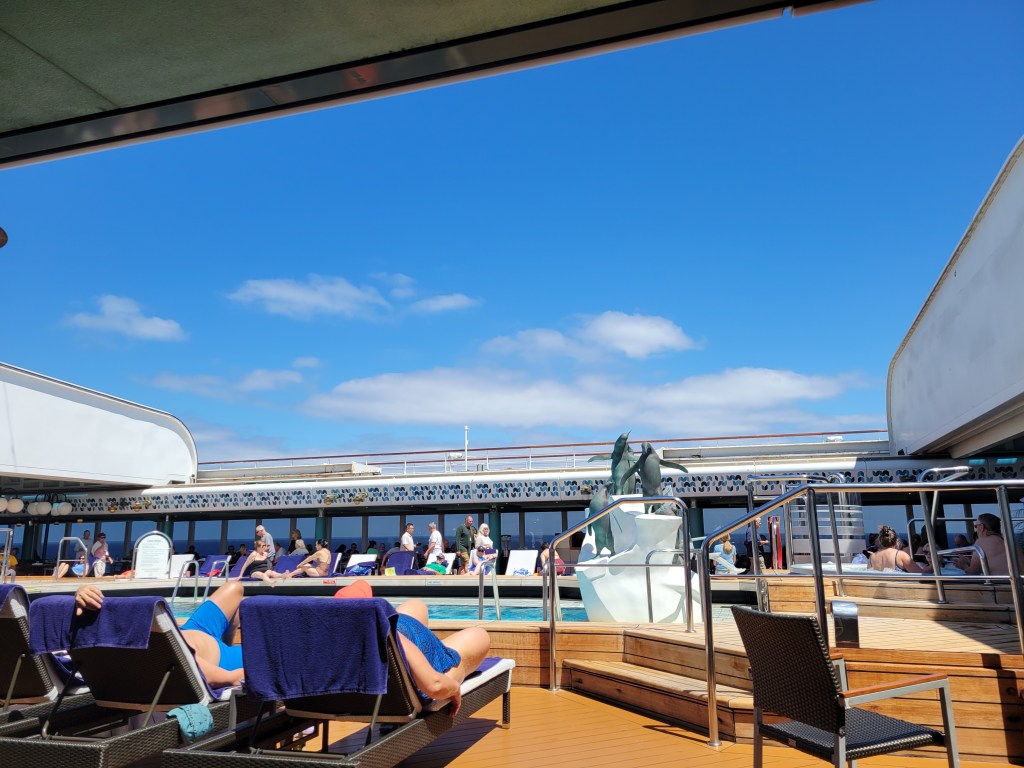 At sea and we began the day in our routine of sea days. Room service coffee, then off to the Crow’s Nest for me to begin working on the website. Lunch. Continue on the website, usually in the cabin with a movie on. Today is was Wicked. So after a short rest, get ready for dinner