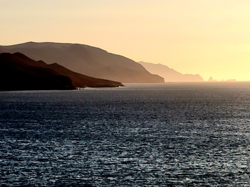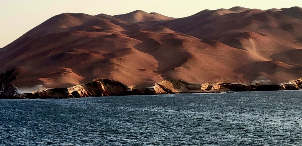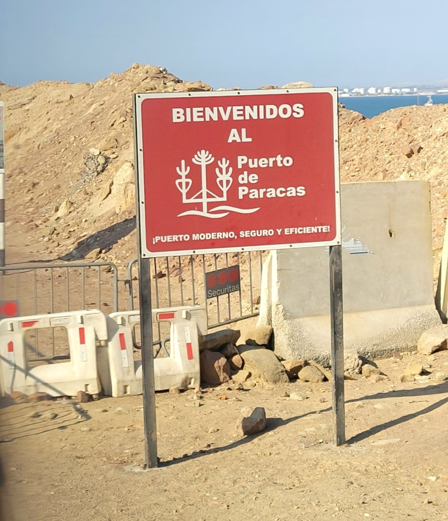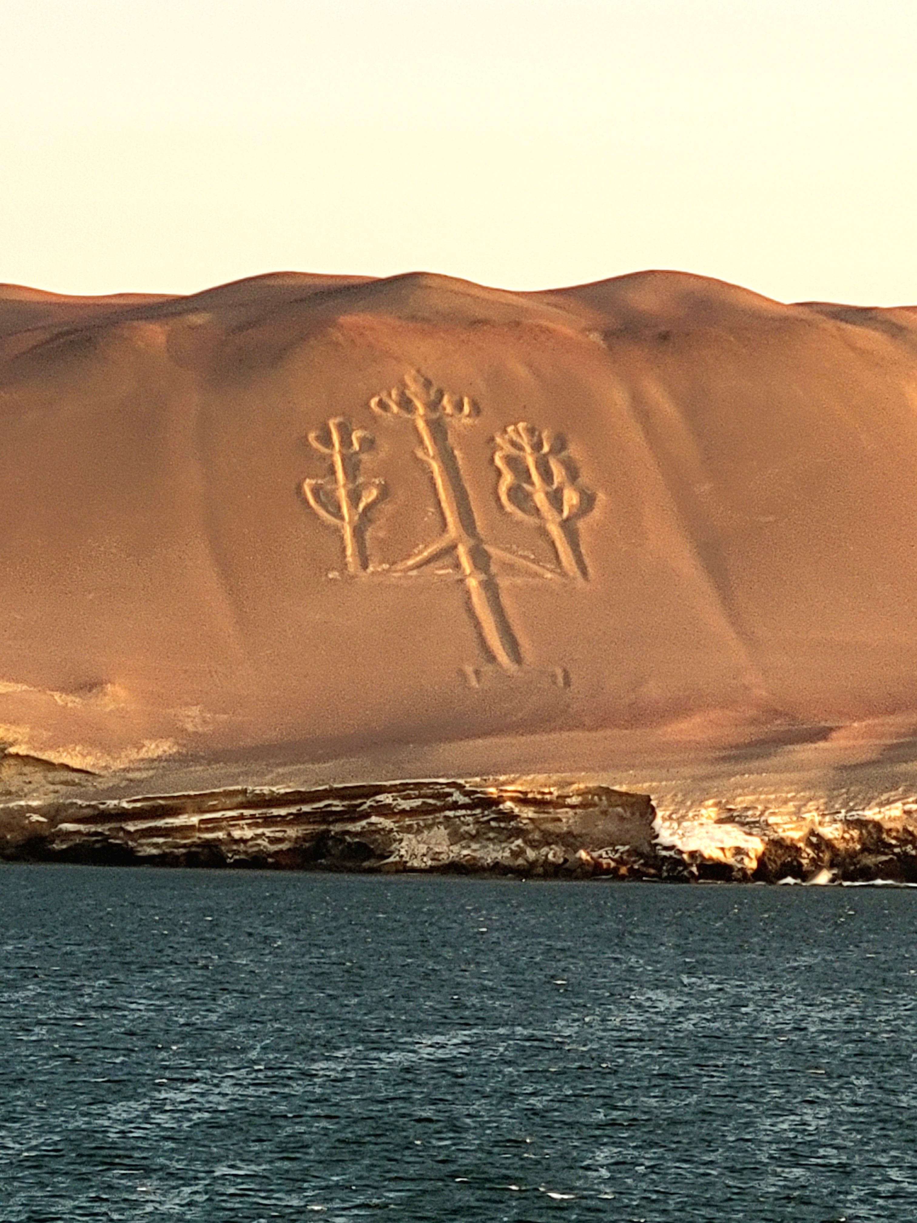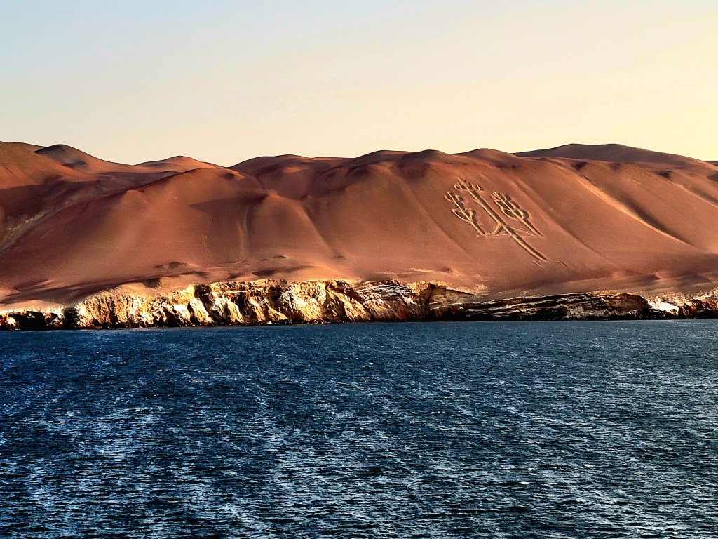 The Captain gave us a surprise, an up-close look at “The Candelabra”. The Paracas Candelabra, also called the Candelabra of the Andes, or El Candelabro (the Trident), is a well-known prehistoric geoglyph found on the northern face of the Paracas Peninsula at Pisco Bay in Peru. Pottery found nearby has been radio carbon dated to 200 BCE, the time of the Paracas culture. The design is cut 2 feet into the soil, with stones possibly from a later date placed around it. The figure is 560 ft tall and 200 ft wide, large enough to be seen12 miles at sea.