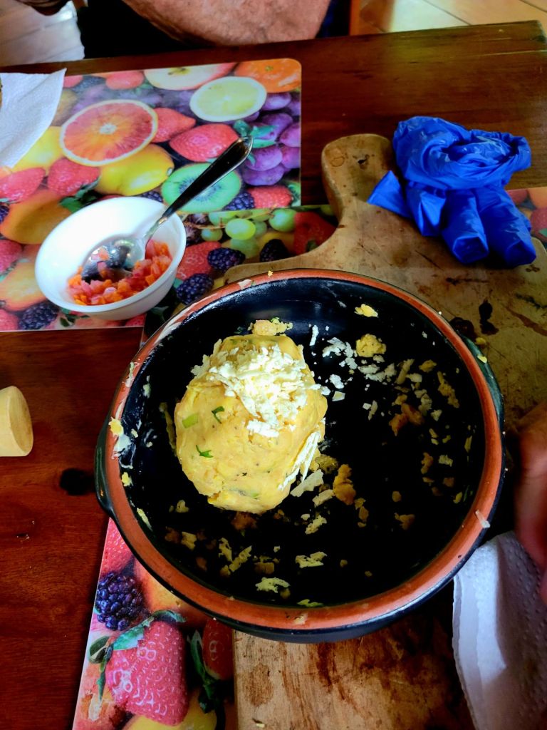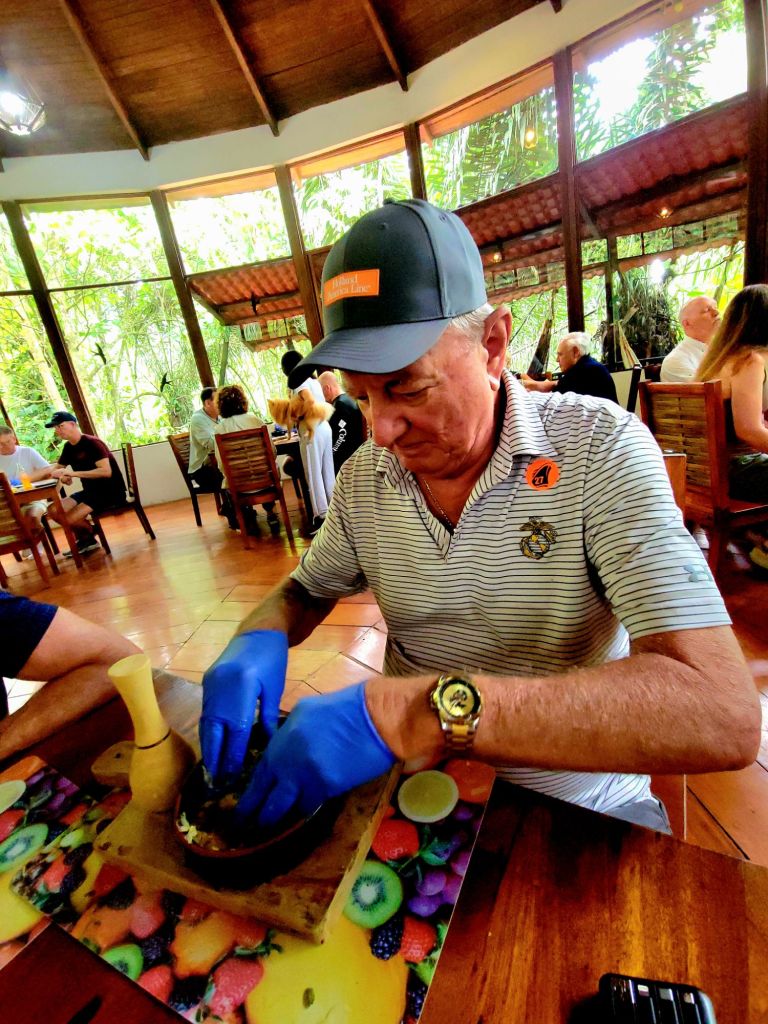 Off to a restaurant in the rain forest for a cooking lesson. Patrick was our table’s voted chef. He prepared our Bolon de Verde. The base is plantain, yes – I tasted it, yes – it was delicious, yes – we plan on making it at home.